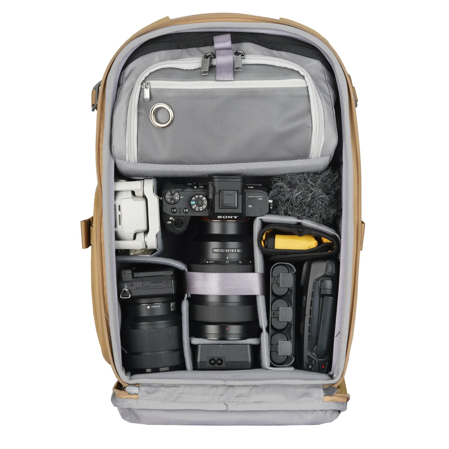 Rucsacul poate transporta o cameră profesională și până la 3 obiective (inclusiv 70–200mm f/2.8). Compartimentul foto este delimitat de separatoare slim EVA, ajustabile, pentru maximizarea spațiului și protecția echipamentului. Accesul la echipament este complet prin spate, iar designul permite și acces lateral rapid sau acces superior pentru fotografiere instantanee.