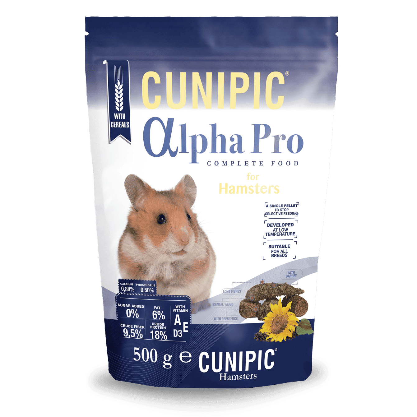 CUNIPIC Alpha Pro 500g este un meniu complet si sanatos pentru hamsteri. Caracteristici Hrana Hamsteri CUNIPIC Alpha Pro 500g: Continut optim de grasimi. Cunipic contine cantitatea ideala de grasimi, ce provin din surse bogate in aicizi omega 3 si omega 6; Contine fibre. Cunipic contine cea mai mare cantitate de fibre pe care o puteti gasi pe piata Hrana preparata la o temperatura scazuta, minimizandu-se astfel pierderea de vitamine si amino acizi din mancare; Asigura uzura dentara optima pentru rozatoare; Contine prebiotice; Cunipic are un continut echilibrat de Calciu si Fosfor.