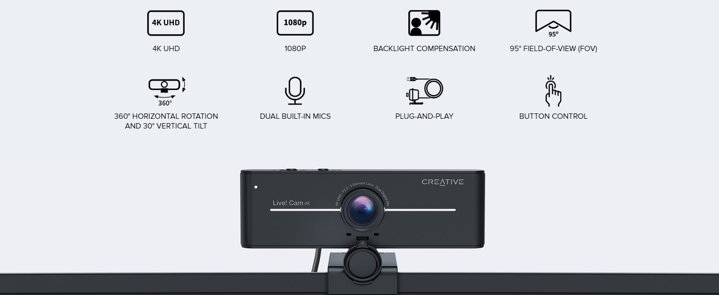 Bucurati-va de o claritate 4K UHD remarcabil de clara, clara si detaliata cu Creative Live! Cam Sync 4K, o camera web plug-and-play conceputa pentru a va maximiza experienta de conferinte video online sau de streaming.
