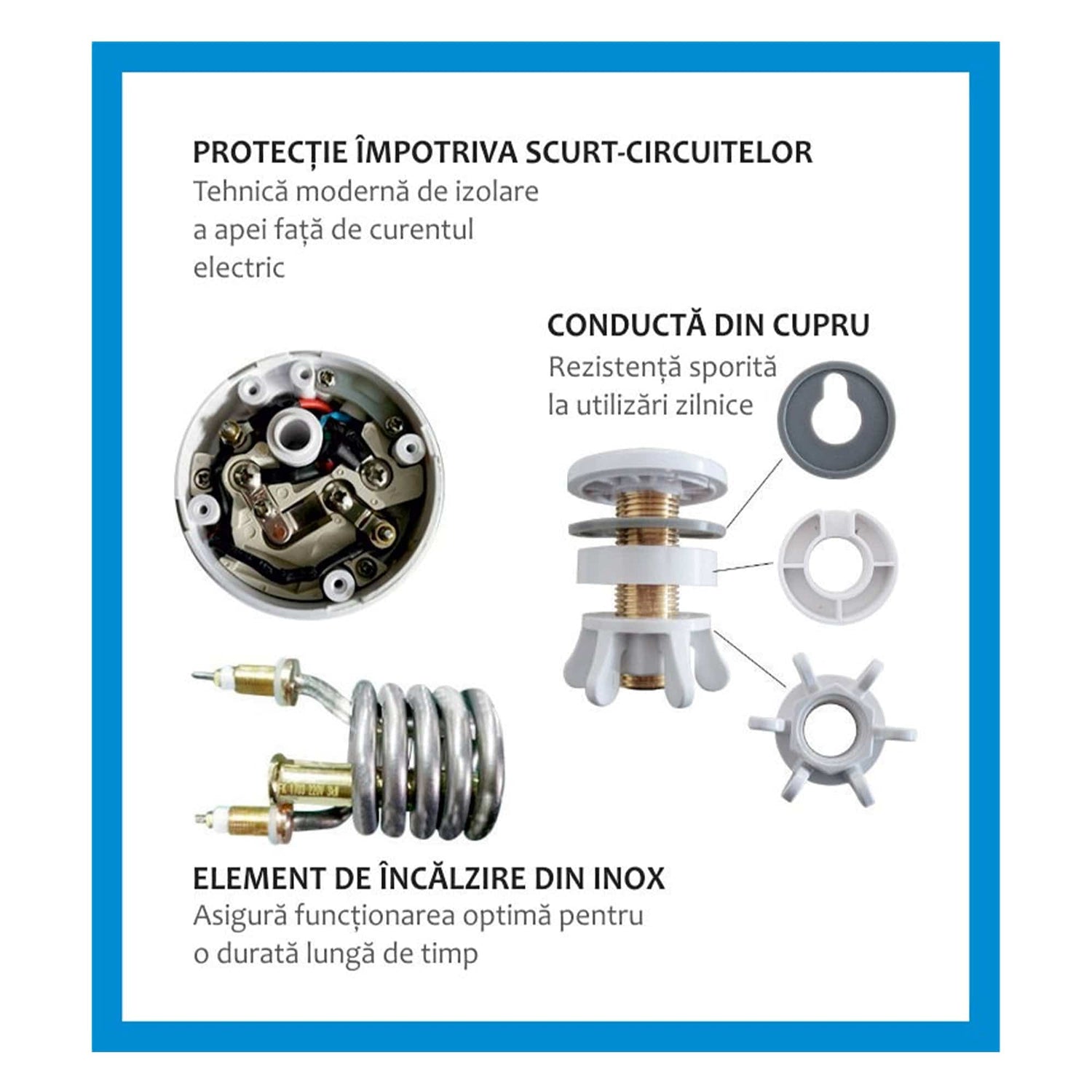 Putere nominala 3000 W Presiune apa 0.04-0.6 MPa Debit apa fierbinte 2-2.5 L/min Reglaj al temperaturii Temperatura apei calde 30-60°C Rotatie 360° Clasa protectie la umezeala IPX4 Intrerupator de siguranta ELCB(Earth-leakage circuit breaker)