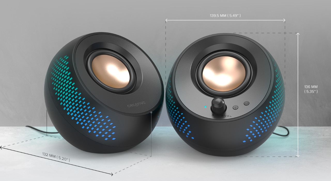 Cu un design sferic minimalist de culoare neagra, cu finisaj mat si iluminare RGB personalizabila, Creative Pebble X imbunatateste orice configuratie de birou, sporind atractivitatea vizuala generala