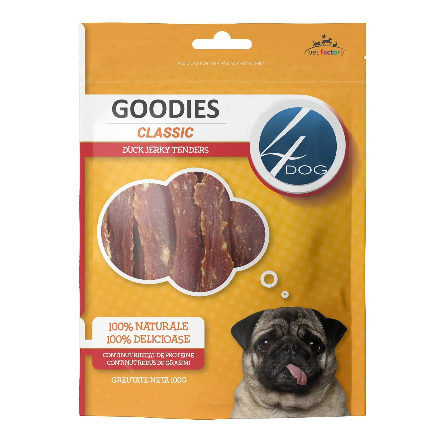 Recompense pentru Caine Adult, 4DOG GOODIES Classic, Jerky Tenders Rata, 100g sunt gustari complementare 100% naturale, perfecte pentru cainii de orice talie si varsta. Aceste fasii moi sunt realizate din carne de rata de calitate superioara, avand o textura frageda si un gust intens, ideale pentru rasfatul zilnic sau ca motivare in timpul dresajului. Rata (90%) ofera o sursa excelenta de proteine animale, gustoase si usor digerabile, care contribuie la mentinerea unei musculaturi sanatoase si a unui sistem imunitar echilibrat. Continutul ridicat de proteina (45%) si grasimile moderate (5%) fac din aceste fasii o alegere potrivita pentru cainii activi sau cei care au nevoie de un plus de energie. Glicerina (3%) si sorbitolul (2%) pastreaza prospetimea si textura moale a produsului, fara a compromite caracterul natural. Recompensele nu contin conservanti sau aditivi artificiali. Compozitie Recompense pentru Caine Adult, 4DOG GOODIES Classic, Jerky Tenders Rata, 100g: Ingrediente: Rata 90%, Proteine din soia 5%, Glicerina 3%, Sorbitol 2%. Valori analitice: Proteina 45%, Grasimi 5%, Fibre 1,5%, Umiditate 18%. Mod de utilizare: Se ofera ca gustare sau recompensa intre mesele principale. Asigurati acces permanent la apa proaspata. Supravegheati cainele in timpul consumului. Depozitare: A se pastra intr-un loc uscat si racoros. Produsul nu este destinat consumului uman.