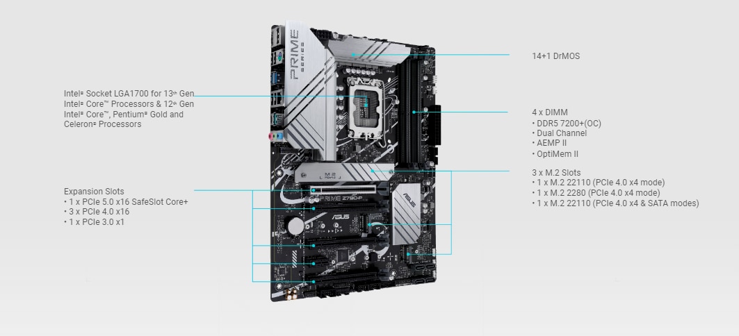 Placile de baza ASUS din seria Prime sunt proiectate cu maiestrie pentru a elibera intregul potential al procesoarelor Intel® Core™ din generatia a 13-a. Dispunand de un design de putere robust, solutii de racire cuprinzatoare si optiuni de reglaj inteligent, PRIME Z790-P ofera utilizatorilor si constructorilor de PC-uri DIY o gama de optimizari de performanta prin intermediul unor functii software si firmware intuitive