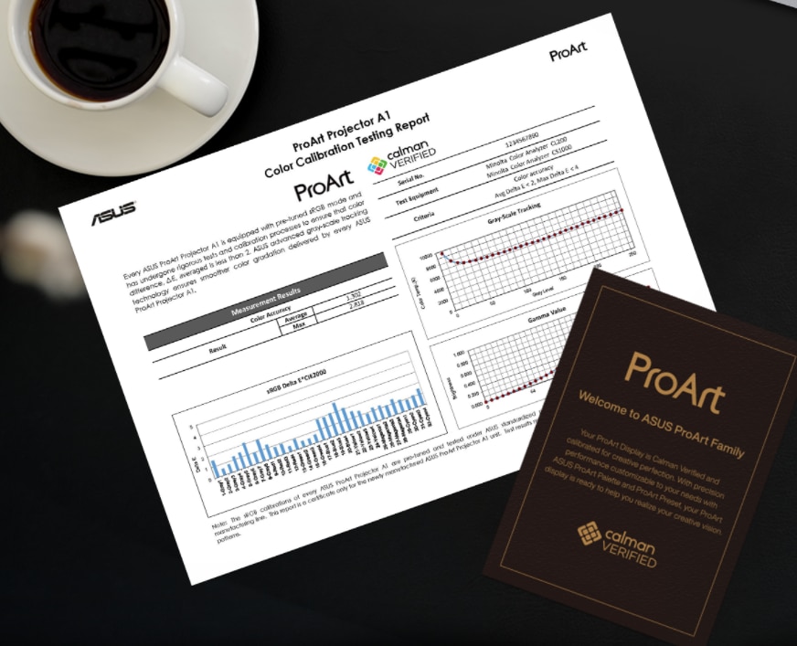 Profesionistii in culoare se bazeaza pe proiectoare cu precizie a culorilor pentru a face creatiile lor sa arate exact asa cum au fost destinate. Avand in vedere acest lucru, proiectorul ProArt A1 este pre-calibrat din fabrica si verificat Calman pentru a garanta performante de varf in industrie. Datorita acuratetei culorilor Delta E < 2, poti fi sigur ca imaginile vor aparea in culori adevarate. Acest lucru face ca proiectorul ProArt A1 sa fie perfect pentru studiouri creative, galerii de arta sau muzee.
