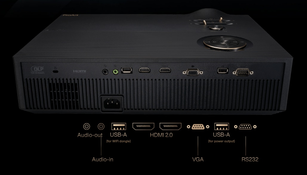 Proiectorul ProArt A1 ofera conectivitate bogata cu doua porturi HDMI® 2.0, VGA, intrare si iesire audio, RS232 si doua porturi USB Type-A - astfel incat sa puteti conecta cu usurinta o mare varietate de dispozitive.