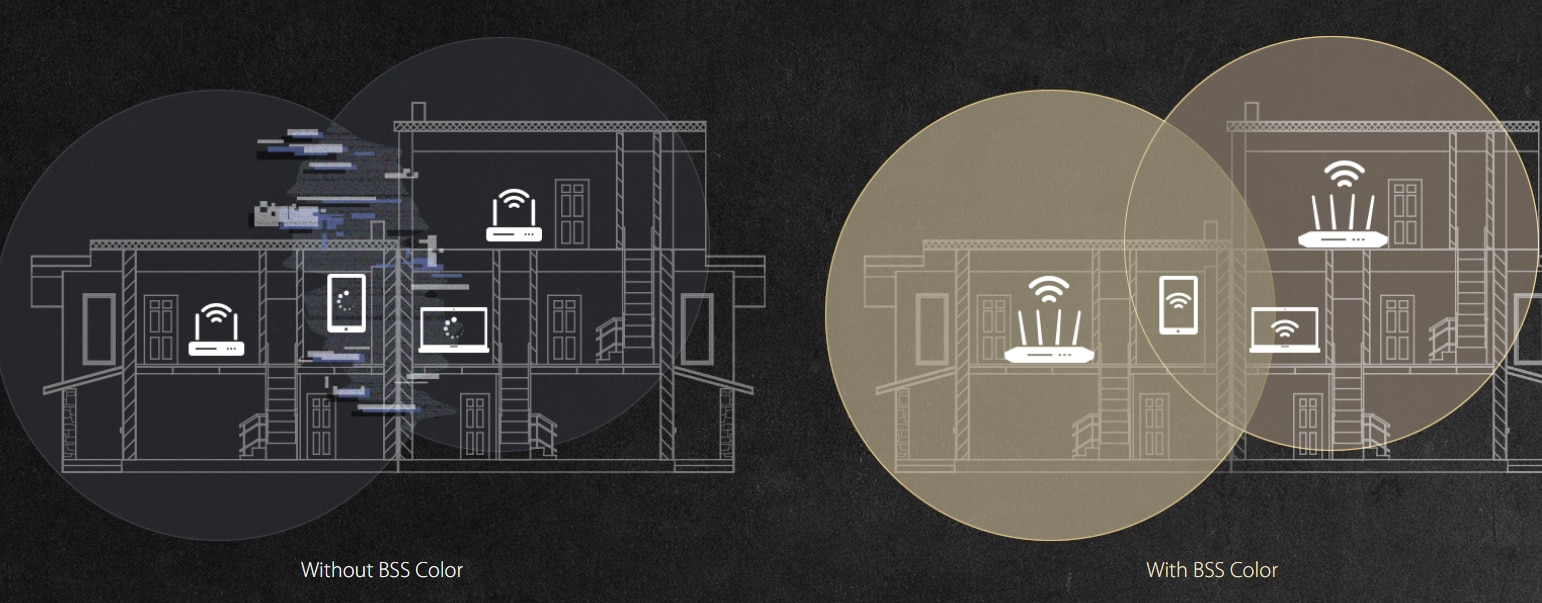 WiFi 6 include o noua caracteristica numita BSS Coloring care imbunatateste eficienta conexiunii WiFi chiar si in medii aglomerate. Atunci cand doua routere invecinate trimit trafic pe acelasi canal, routerul dvs. trebuie sa astepte pana cand canalul este liber. Cu BSS Coloring, routerul WiFi 6 isi identifica datele cu o eticheta de canal unica („culoare”) care este diferita de cea a retelelor vecine. Routerul WiFi 6 poate ignora apoi semnalele de alta culoare de pe canal si poate trimite date imediat.* Acest lucru reduce considerabil timpii de asteptare ai routerului si sporeste eficienta retelei.