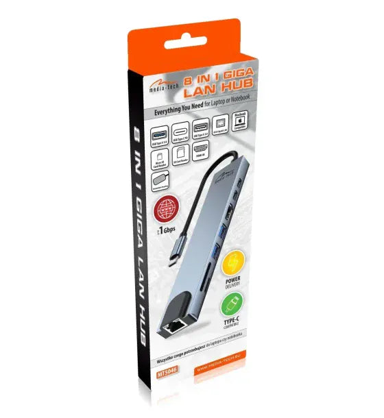 8 in 1 GIGA LAN HUB - USB-C Docking Station Ports: 1xRJ45 (1000 Mbps) 1xUSB-A 30 1xUSB-A 20 1 x USB-C PD 20V@5A max 100W HDMI 4K SD microSD