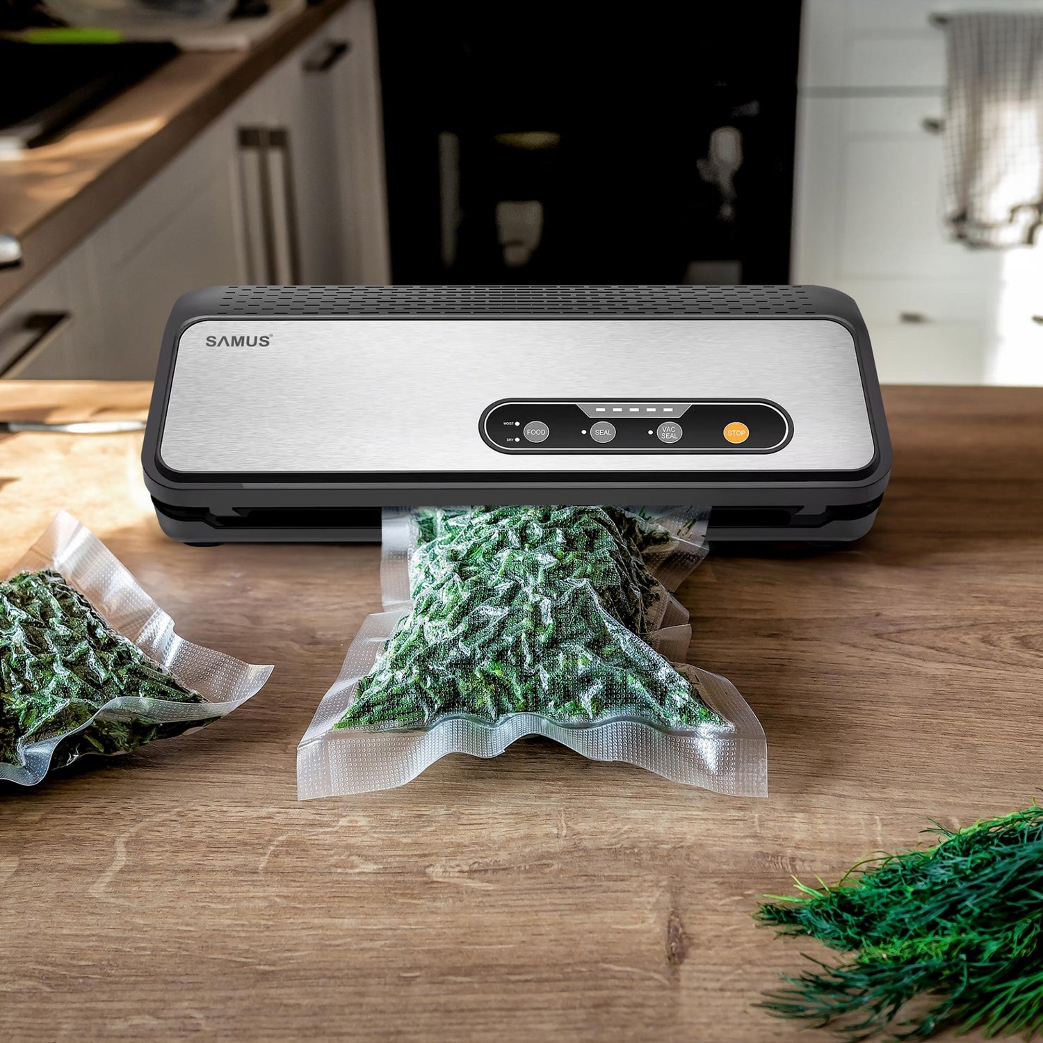 Cele 5 functii ale aparatului: etansare, vidare si etansare, mod aliment, mod viteza, oprire vin in sprijinul tau si iti ofera mai multe posibilitati pentru rezolvarea nevoilor tale. De la o etansare perfecta pana la protectia alimentelor fragile, Samus creaza cea mai buna experienta in bucataria ta.
