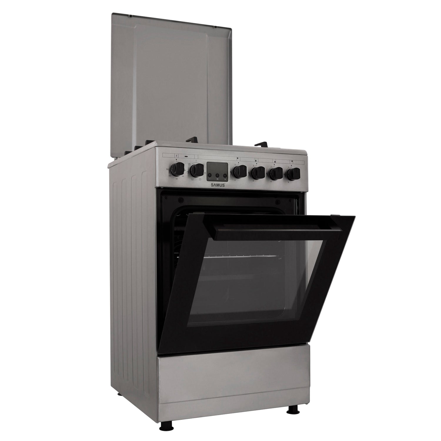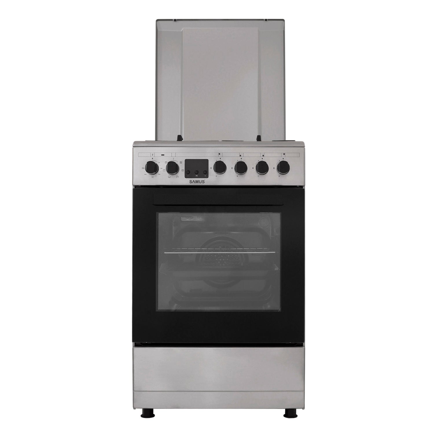 Aragaz Samus SM563AENS INOX - diuze montate GN, 50x60, 4 arzatoare pe gaz, cuptor electric , aprindere electrica, 7 functii cuptor, Display