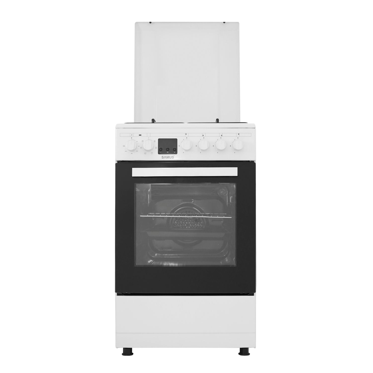 Aragaz Samus SM563AENS WHITE - diuze montate GN, 50x60, 4 arzatoare pe gaz, cuptor electric , aprindere electrica, 7 functii cuptor, Display