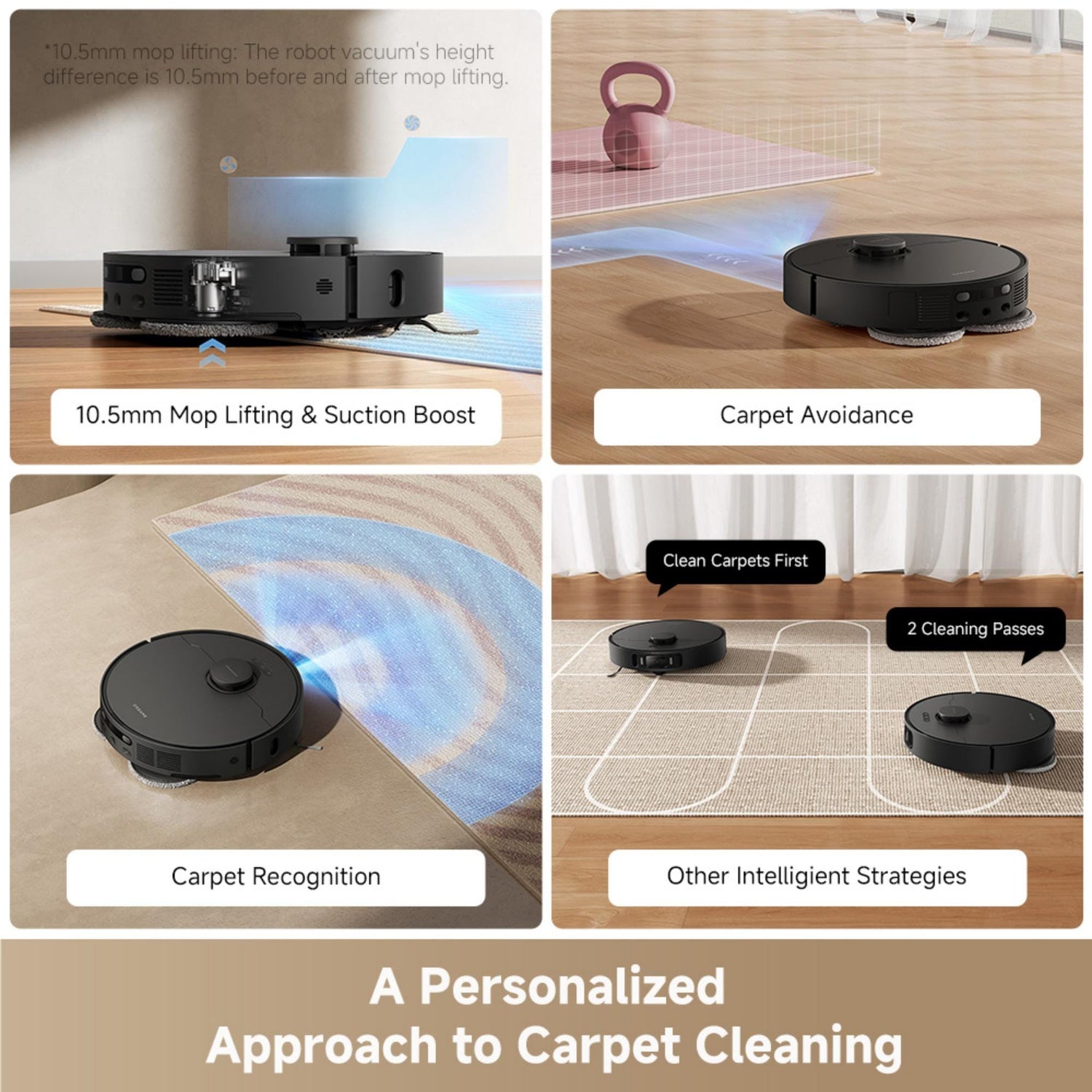 - Navigatie inteligenta cu senzori - Sistemul de navigatie cartografiaza locuinta si planifica trasee optime de curatare. Senzorii de obstacole si anti-cadere asigura functionarea sigura in orice mediu.