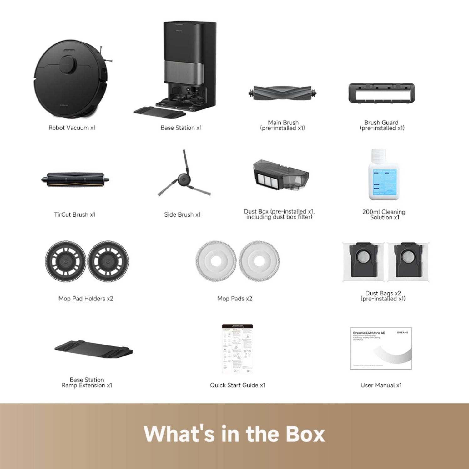 Aspirator robot Dreame RLL77SE-BLACK, statie incarcare, mopuri, perii laterale, manual utilizare, certificat garantie.