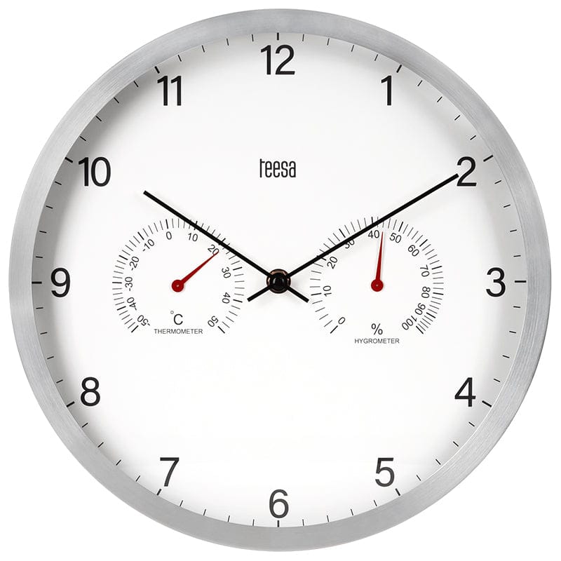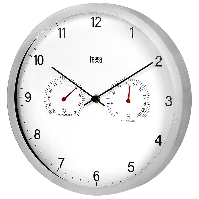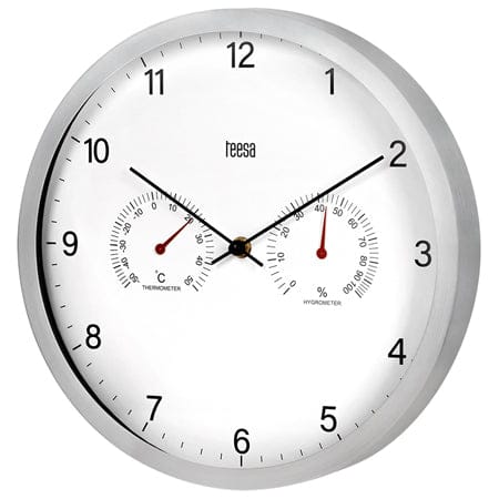 Descriere: CARACTERISTICI PRINCIPALE ---------- Mișcare cu quartz cu afișare analogică a timpului Cadran alb cu cifre arabe Termometru și higrometru Orificiu pentru agățat pe perete DATE TEHNICE ---------- Material: aluminiu, sticla Adâncime: 4 cm Diametru: 30 cm Greutate: 596 g Alimentare: 1x baterie AA (nu este inclusa)