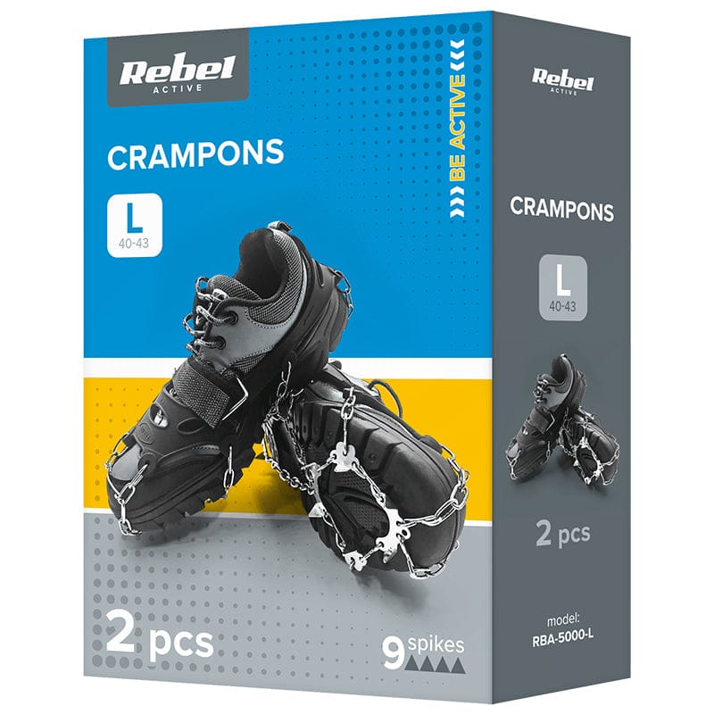Descriere: Număr de vârfuri: 9 Înălțimea vârfurilor: 14 mm Marime: L (41-44) Material: • Tepi: oțel inoxidabil • Lanturi: otel inoxidabil • Clemă: silicon Curea de siguranță Marcaj față/spate Inserția integrată facilitează punerea și scoaterea mânerelor 2 bucăți într-un set Husa inclusa