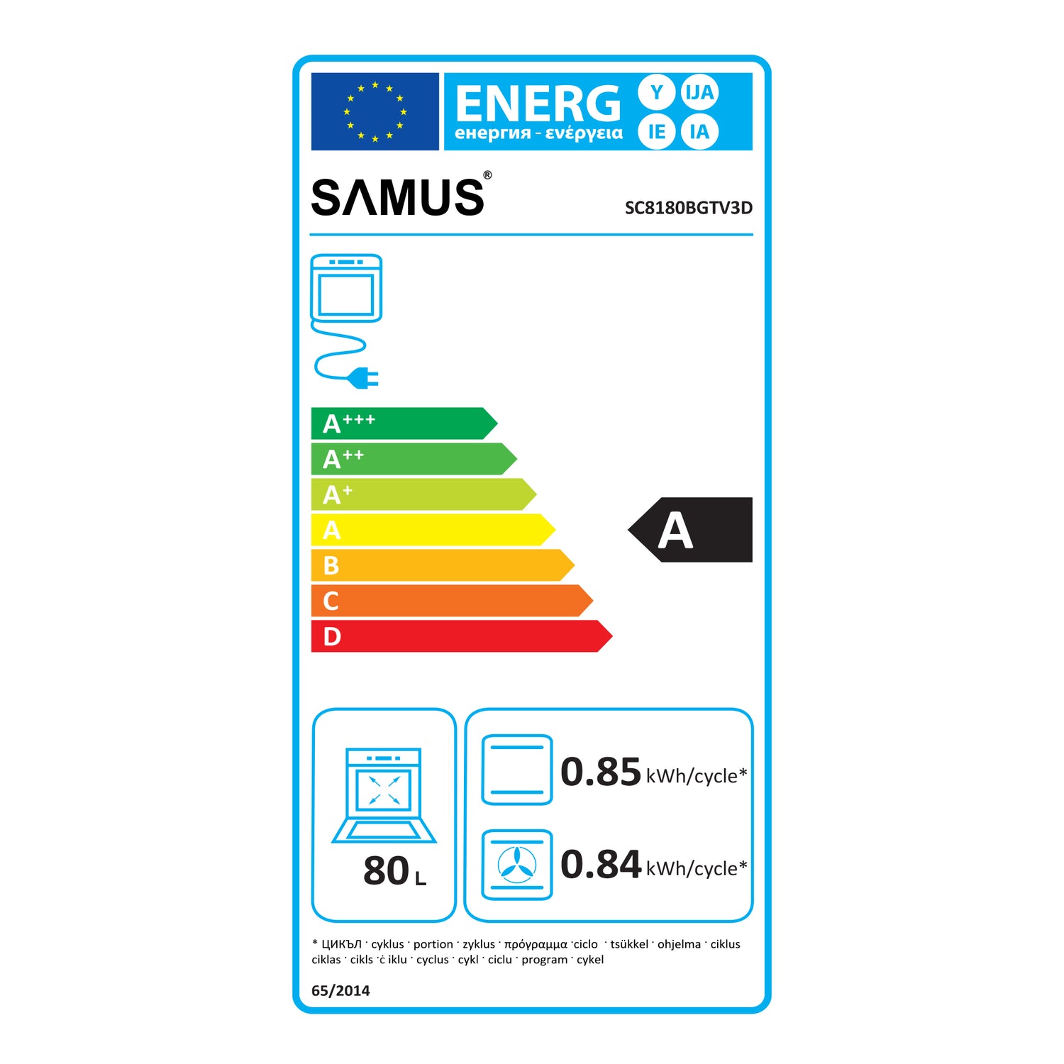 Cuptor Built-In-Rustic Samus SC8180BGTV3D - panou slim din sticlă neagră, capacitate 80 litri, 8 funcţii+gătire 3D, putere cuptor 2500 W, grill electric, ventilator, timer mecanic, şine