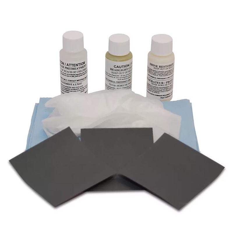 Acest kit vă va oferi tot ceea ce aveţi nevoie pentru a curăţa două faruri de maşină: - 1 sticlă cu Pretratament pe bază de apă (29,5 ml) - 1 sticlă de agent de curăţare/luciu (29,5 ml), 1 sticlă de agent de restaurare/păstrare a luciului (29,5 ml) - 1 bucată şmirghel 600 (mare) - 1 bucată şmirghel 1500 (medie) - 1 bucată şmirghel 2000 (fină) - 10 şerveţele - 1 pereche de mănuşi (mărime universală)