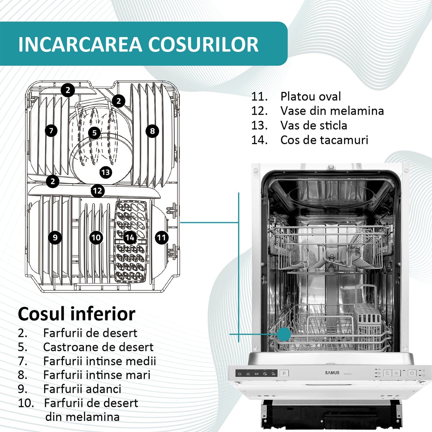 Masina Spalat Vase Built-In Samus SBDW46.5 - complet incorporabilă, lăţime 45 cm, capacitate 9 seturi, coş inferior+coş superior+coş tacâmuri, 5 programe: Intensiv, Universal, Eco, 90 min, Rapid, clasa de energie E, control electronic cu LED
