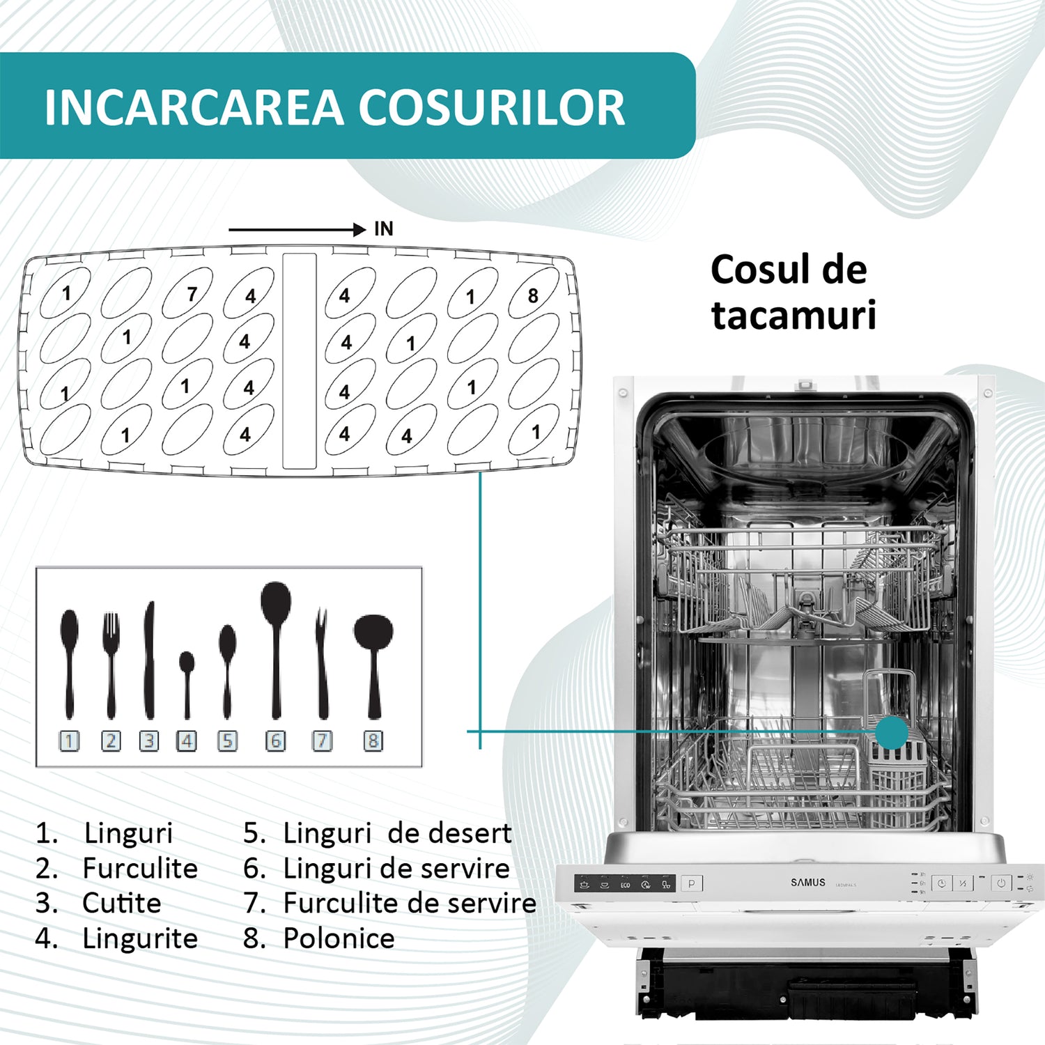 Masina Spalat Vase Built-In Samus SBDW46.5 - complet incorporabilă, lăţime 45 cm, capacitate 9 seturi, coş inferior+coş superior+coş tacâmuri, 5 programe: Intensiv, Universal, Eco, 90 min, Rapid, clasa de energie E, control electronic cu LED este în așteptare și va fi expediat imediat ce revine în stoc.
