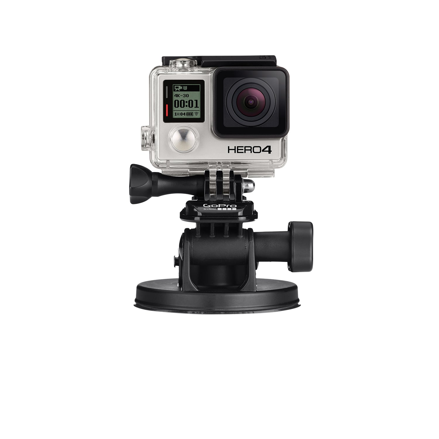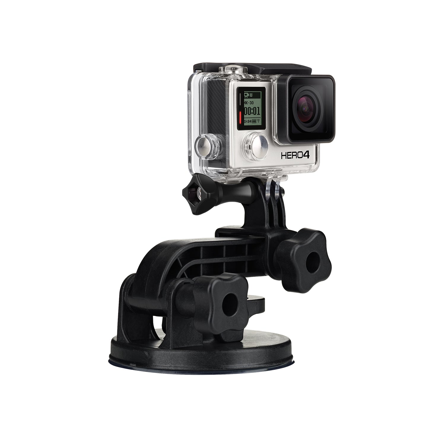 Montura GoPro cu ventuză permite fixarea sigură a camerei pe suprafețe plane, netede și rezistente, precum mașini, geamuri sau echipamente.