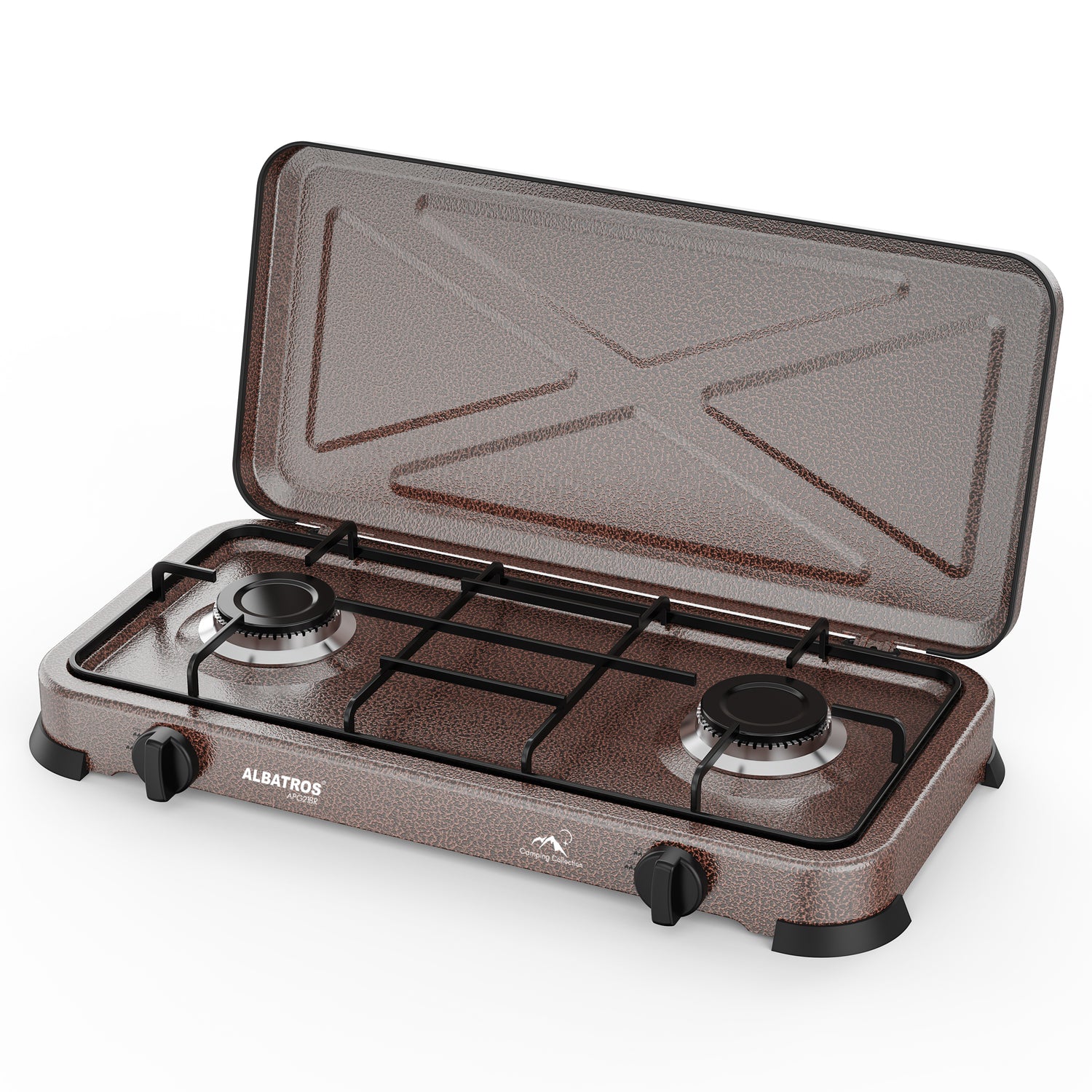 Plită pe gaz Albatros APG21BR - maro, poate fi utilizata doar in spatii exterioare, 2 arzatoare, putere 4,4 kW(2x2,2 kW), suprafata emailata, montata pentru a fi utilizata cu gaz GPL(tip aragaz), gratar metalic emailat, butoane ergonomice, capac de protec este în așteptare și va fi expediat imediat ce revine în stoc.