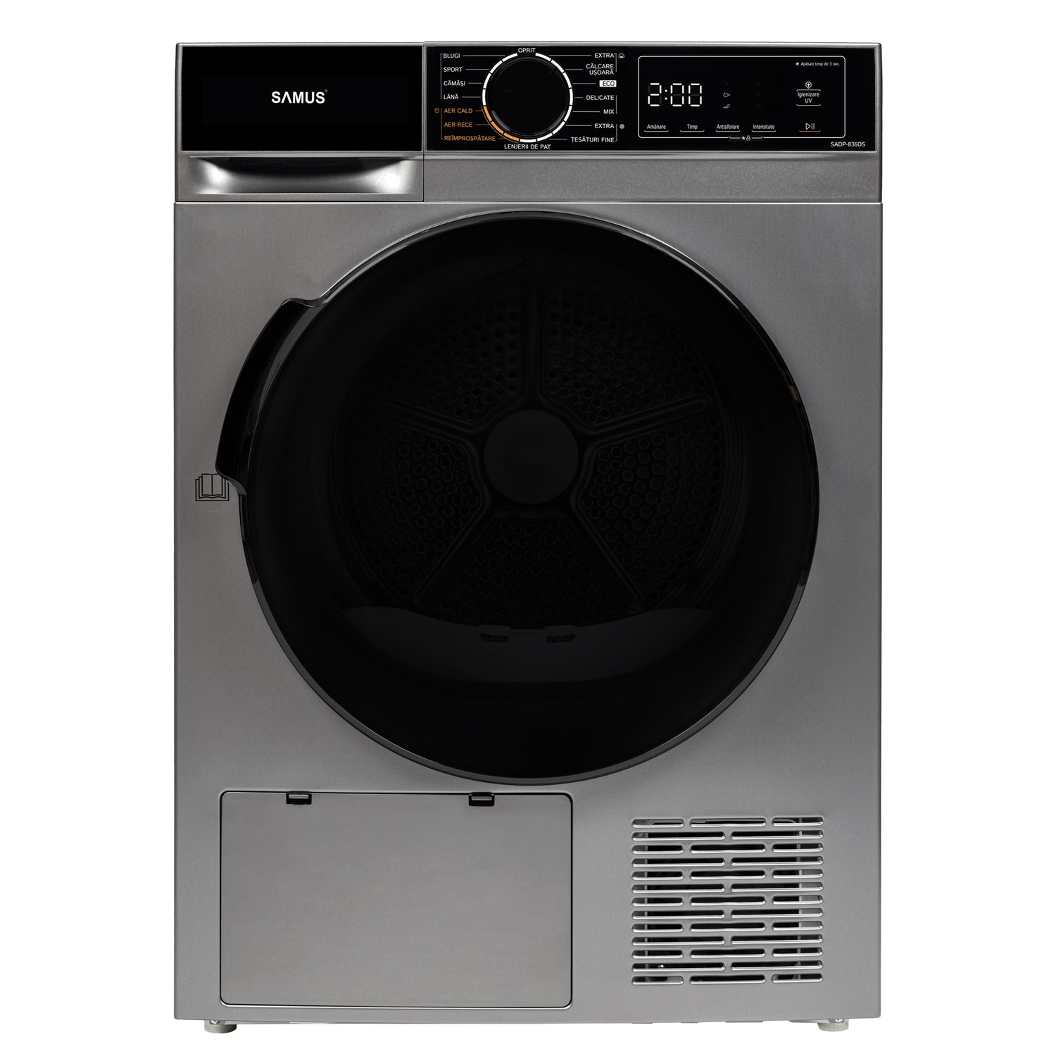 Uscator Rufe Samus SADP-836DS - Capacitate 8 kg ▪ Afişaj electronic ▪ Tip procedură uscare: pompă de căldură ▪Programator electronic ▪ 15 programe ▪ Programe speciale: Blugi, Sport, Cămăși, Lână, Reîmprospătare, Călcare ușoară, eco, Delicate, Mix, Țesătur